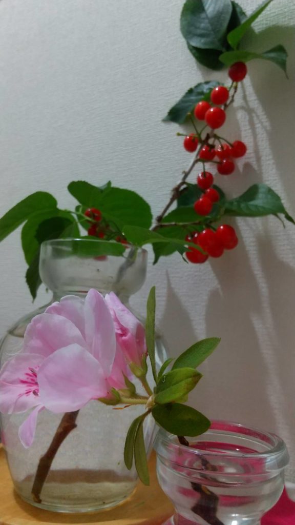 事務所の玄関にはつつじとさくらんぼ🍒がとってもきれいで入るたび癒されます😊